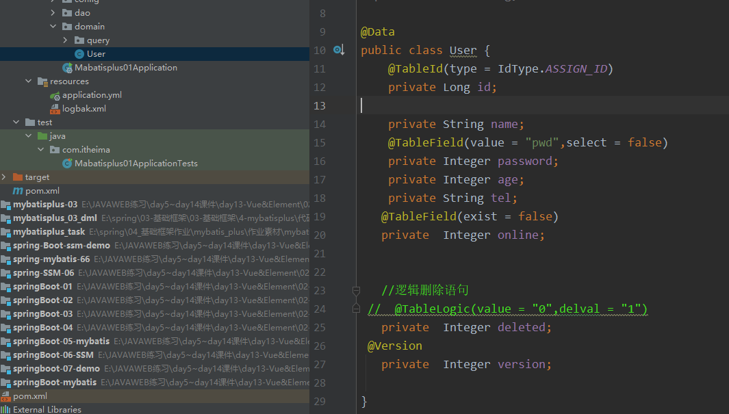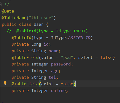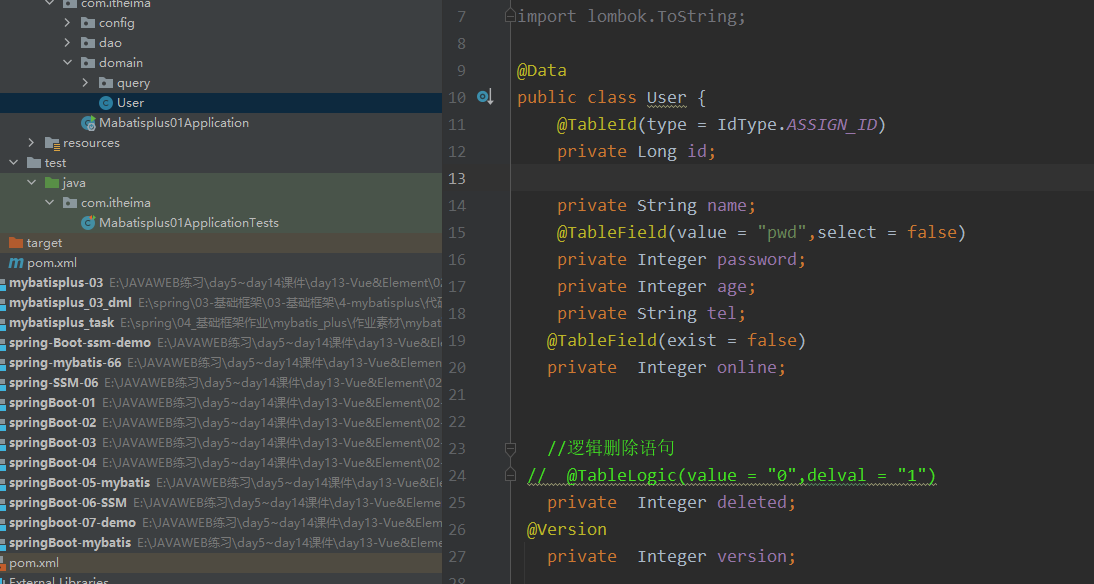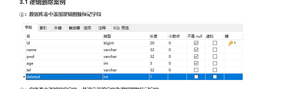 这里首先先在实体类中增加deleted字段 使用注解@tablelogic 设置对应删除的值和未删除的值 表中则要设置默认值为0