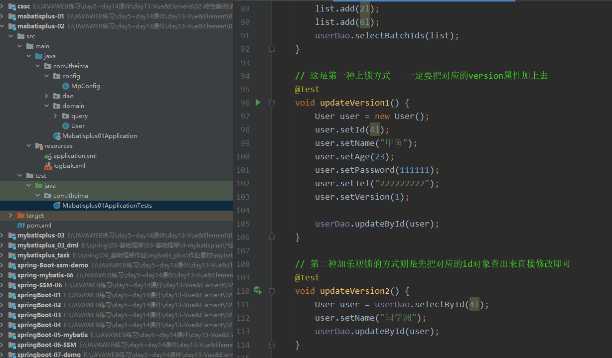 首先先创建表字段 设置默认值为1 然后在实体类中定义字段这里用到注解@version 然后在config配置文件中添加拦截器 最后在测试使用的时候有两种方式第一种需要把对应的version字段set出来 第二种情况首先先把对应的id数据查出来这样里面就会有version
