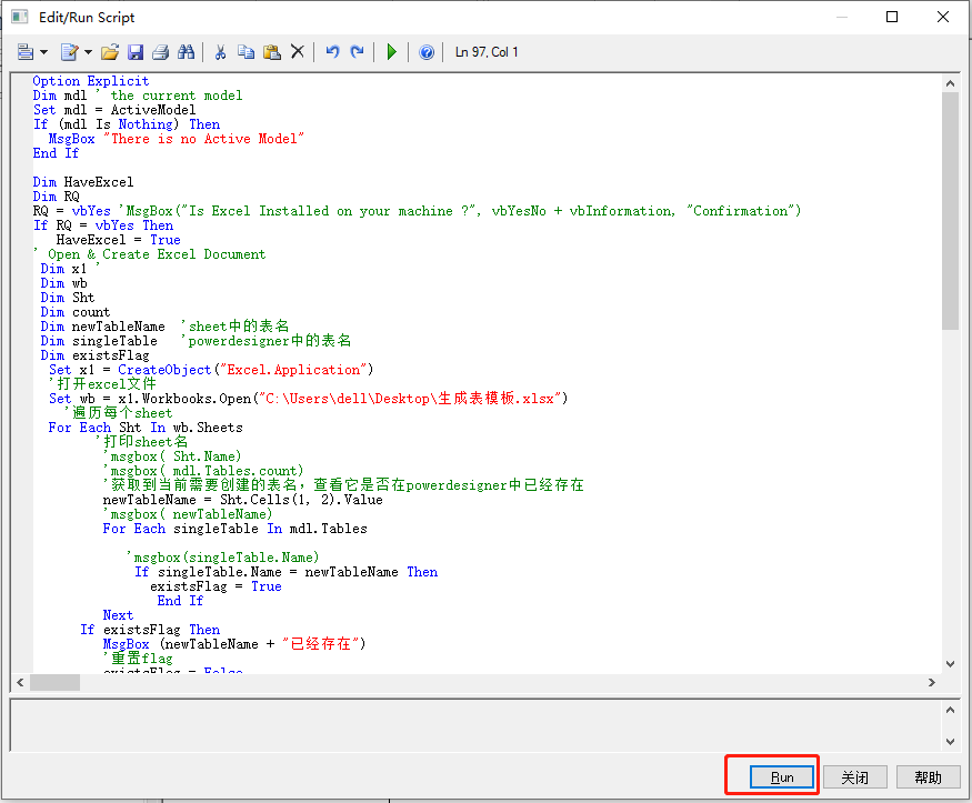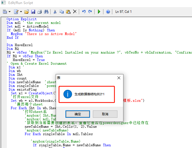 Option Explicit Dim mdl ' the current model Set mdl = ActiveModel If (mdl Is Nothing) Then MsgBox "There is no Active Model" End If Dim HaveExcel Dim RQ RQ = vbYes 'MsgBox("Is Excel Installed on your machine ?", vbYesNo + vbInformation, "Confirmation") If RQ = vbYes Then HaveExcel = True ' Open & Create Excel Document Dim x1 ' Dim wb Dim Sht Dim count Dim newTableName 'sheet中的表名 Dim singleTable 'powerdesigner中的表名 Dim existsFlag Set x1 = CreateObject("Excel.Application") '打开excel文件 Set wb = x1.Workbooks.Open("C:\Users\dell\Desktop\生成表模板.xlsx") '遍历每个sheet For Each Sht In wb.Sheets '打印sheet名 'msgbox( Sht.Name) 'msgbox( mdl.Tables.count) '获取到当前需要创建的表名,查看它是否在powerdesigner中已经存在 newTableName = Sht.Cells(1, 2).Value 'msgbox( newTableName) For Each singleTable In mdl.Tables 'msgbox(singleTable.Name) If singleTable.Name = newTableName Then existsFlag = True End If Next If existsFlag Then MsgBox (newTableName + "已经存在") '重置flag existsFlag = False Else '调用子模块 immigrate_function Sht, mdl count = count + 1 End If Next MsgBox "生成数据表结构共计" + CStr(count), vbOK + vbInformation, "表" '关闭流 Set Sht = Nothing wb.Close Set wb = Nothing x1.Quit Set x1 = Nothing Else HaveExcel = False End If '子程序模块 Sub immigrate_function(Sht, mdl) Dim rwIndex Dim tableName Dim colname Dim table Dim col 'on error Resume Next For rwIndex = 1 To 1000 Step 1 With Sht If .Cells(rwIndex, 1).Value = "" Then rwIndex = rwIndex + 1 If .Cells(rwIndex, 1).Value = "" Then Exit For End If End If If rwIndex = 1 Then Set table = mdl.Tables.CreateNew table.Name = .Cells(rwIndex, 2).Value ElseIf rwIndex = 2 Then table.Code = .Cells(rwIndex, 2).Value rwIndex = rwIndex + 1 Else colname = .Cells(rwIndex, 1).Value Set col = table.Columns.CreateNew col.Name = .Cells(rwIndex, 1).Value col.Code = .Cells(rwIndex, 2).Value col.Comment = .Cells(rwIndex, 4).Value col.DataType = .Cells(rwIndex, 3).Value End If End With Next End Sub