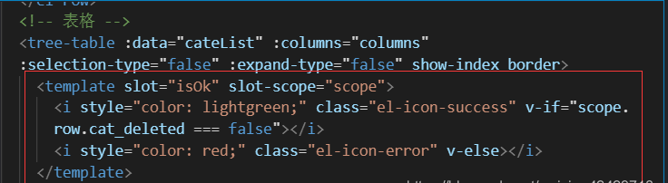 然后在我们界面表格区域,添加一个 template 模板,然后设置作用域插槽 slot 为在数据块定义的模板名称 isOk