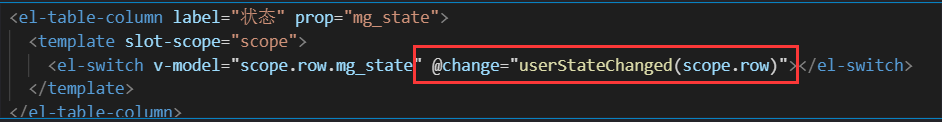 首先,在 switch 开关添加一个 change 事件,并且通过作用域插槽的形式,将该行数据作为参数传入,目的是为了后续的修改。