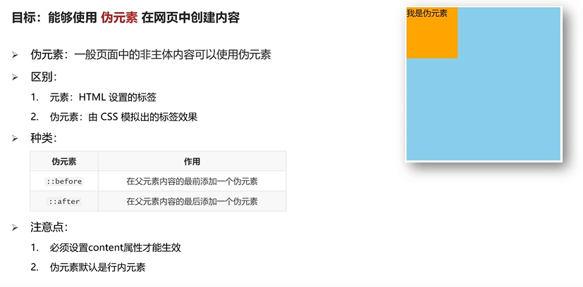 <!-- 伪元素 通过css创建标签, 装饰性的不重要的小图 -->