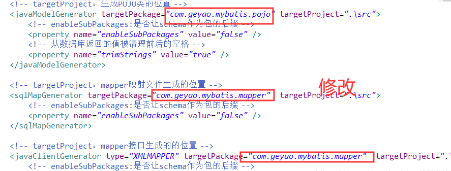<javaModelGenerator targetPackage="com.geyao.mybatis.pojo" targetProject=".\src">