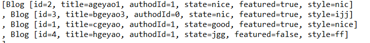 return "Blog [id=" + id + ", title=" + title + ", authodId=" + authodId + ", state=" + state + ", featured="