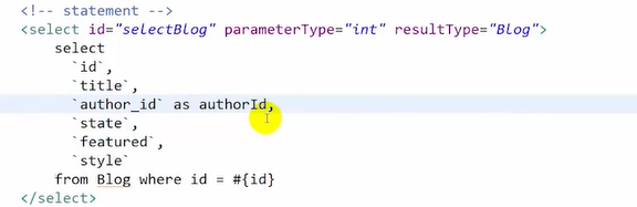 <select id="selectBlog" parameterType="int" resultType="Blog">