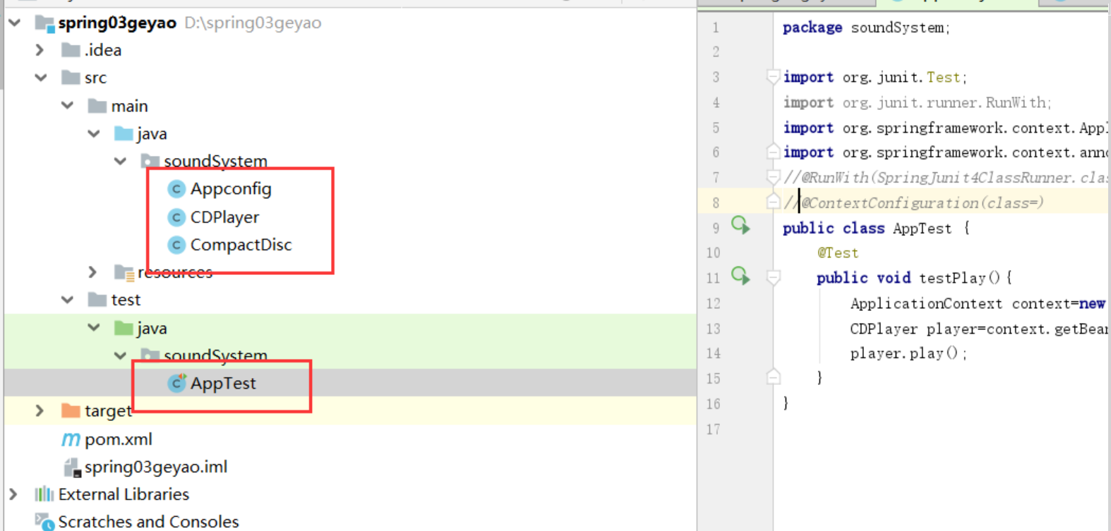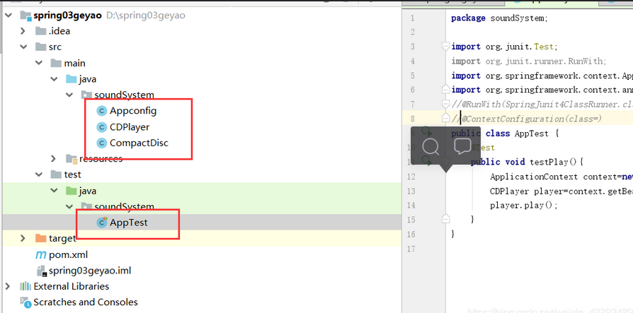Pre-instantiating singletons in org.springframework.beans.factory.support.DefaultListableBeanFactory@124c278f: defining beans [org.springframework.context.annotation.internalConfigurationAnnotationProcessor,org.springframework.context.annotation.internalAutowiredAnnotationProcessor,org.springframework.context.annotation.internalRequiredAnnotationProcessor,org.springframework.context.event.internalEventListenerProcessor,org.springframework.context.event.internalEventListenerFactory,appconfig,CDPlayer,compactDisc]; root of factory hierarchy