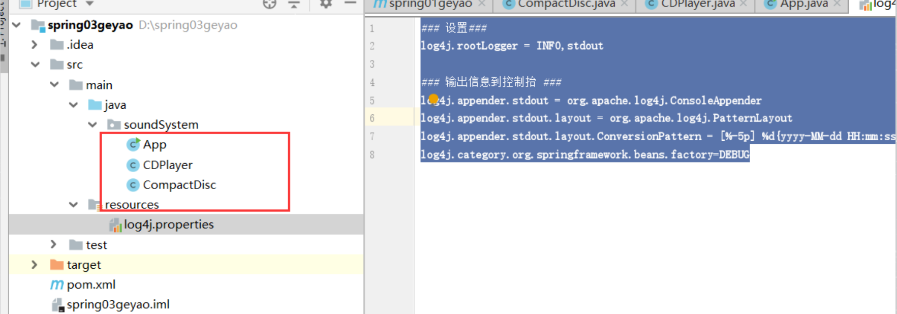 Pre-instantiating singletons in org.springframework.beans.factory.support.DefaultListableBeanFactory@40f08448: defining beans [org.springframework.context.annotation.internalConfigurationAnnotationProcessor,org.springframework.context.annotation.internalAutowiredAnnotationProcessor,org.springframework.context.annotation.internalRequiredAnnotationProcessor,org.springframework.context.event.internalEventListenerProcessor,org.springframework.context.event.internalEventListenerFactory,appconfig,CDPlayer,compactDisc]; root of factory hierarchy