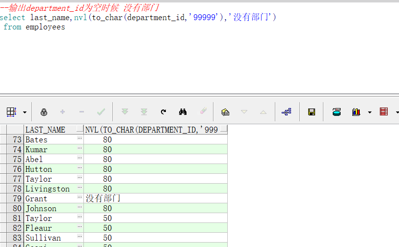 select last_name,nvl(to_char(department_id,'99999'),'没有部门')
