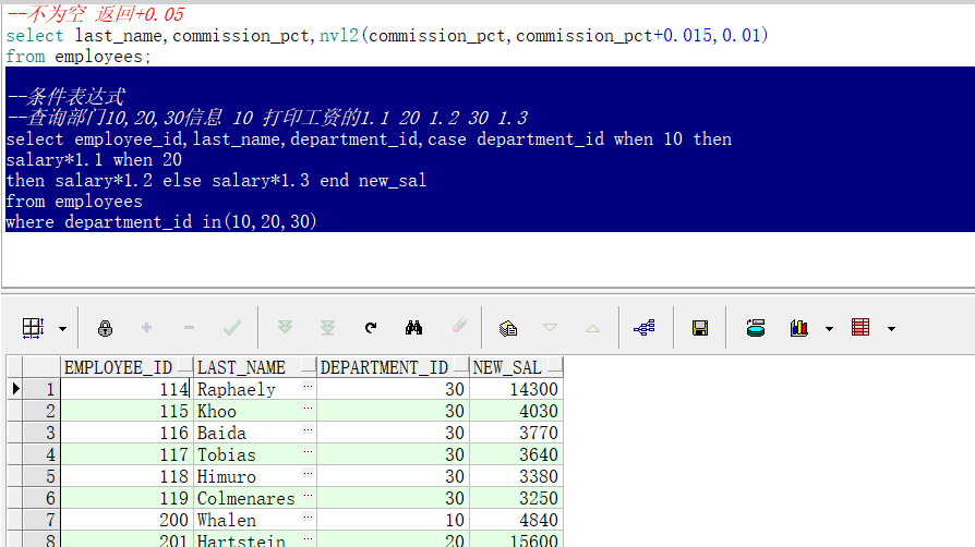 select employee_id,last_name,department_id,decode(department_id,10,salary*1.1,