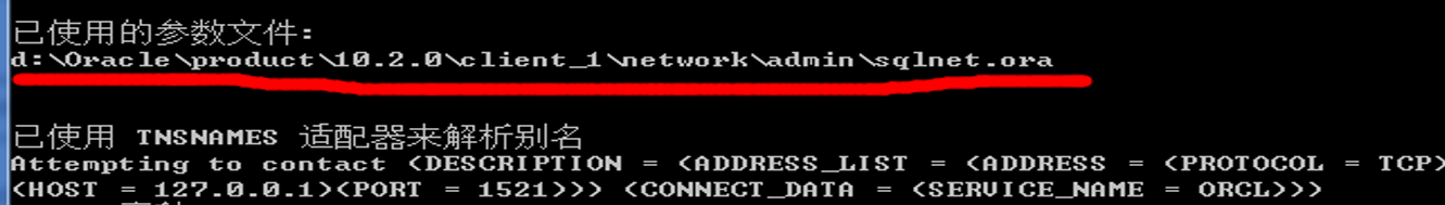 2.是否使用了正确的tnsnames.ora 文件 原因:同一台电脑上安装了oralce服务端和客户端 查询如下: cmd> tnsping docare 重点查看: 以使用的参数文件部分 确定访问使用的是哪个 解决方案: 方法一. 配置实际访问的tnsnames.ora 文件 方法二. 修改环境变量Path 把实际使用的oracle路径放到最左边