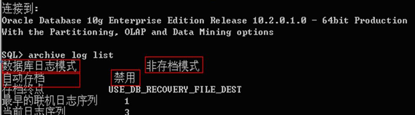 如果“数据库日志模式”为“非存档模式” 按照如下开启归档模式: 提示:使用 sqlplus / as sysdba 方式登录