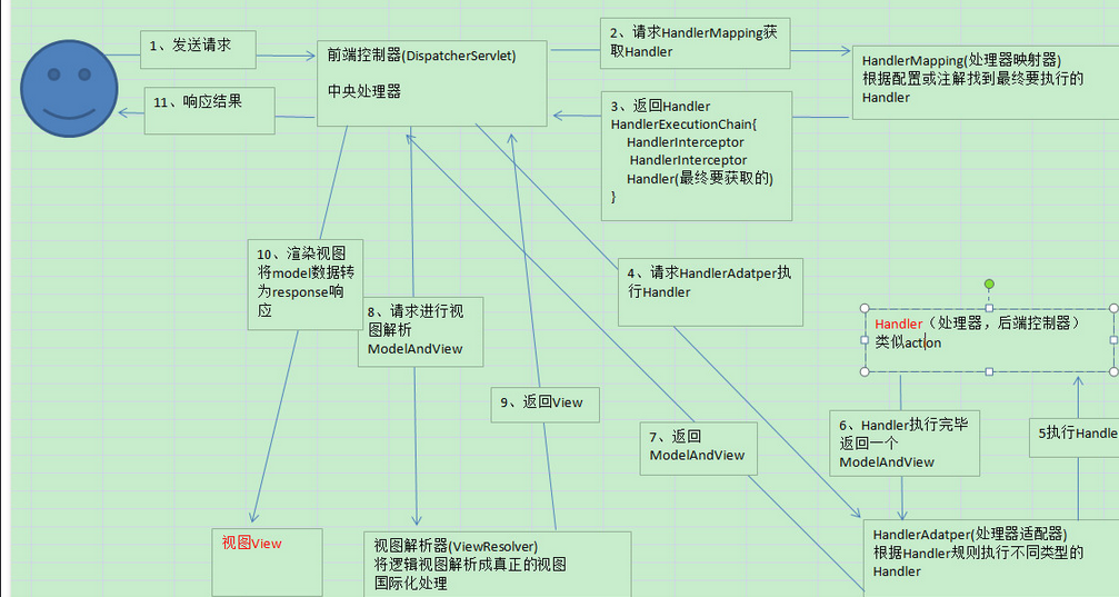 看到这些步骤我相信大家很感觉非常的乱,这是正常的,但是这里主要是要大家理解springMVC中的几个组件: