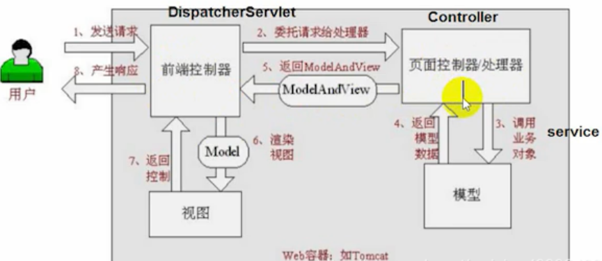 用户请求到达前端控制器,它就相当于mvc模式中的c,dispatcherServlet是整个流程控制的中心,由它调用其它组件处理用户的请求,dispatcherServlet的存在降低了组件之间的耦合性。
