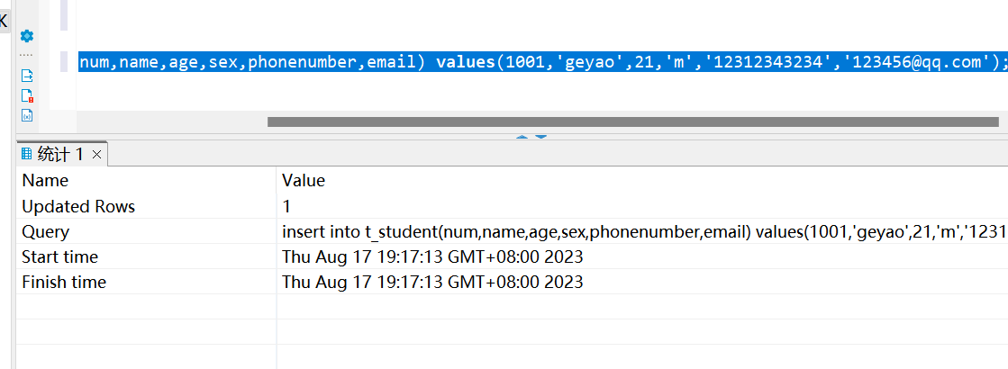 insert into t_student(num,name,age,sex,phonenumber,email) values(1001,'geyao',21,'m','12312343234','123456@qq.com');