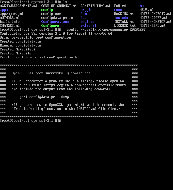 - 参考https://www.cnblogs.com/rocedu/p/5087623.html先在Ubuntu中完成OpenSSL编译安装,然后在OpenEuler中重现