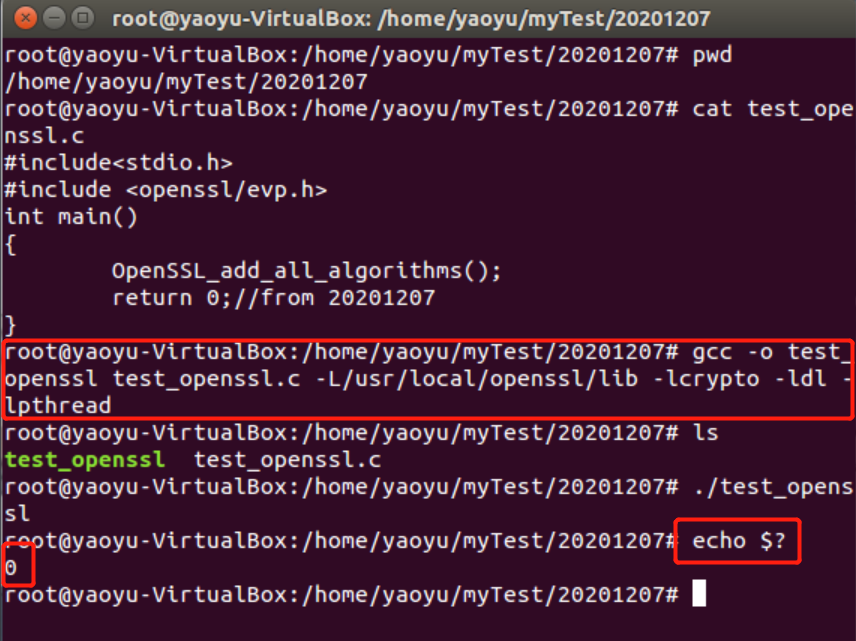 ./config --prefix=..(学号目录的绝对路径)指定OpenSSL编译链接- 提交 test_openssl.c 编译运行截图