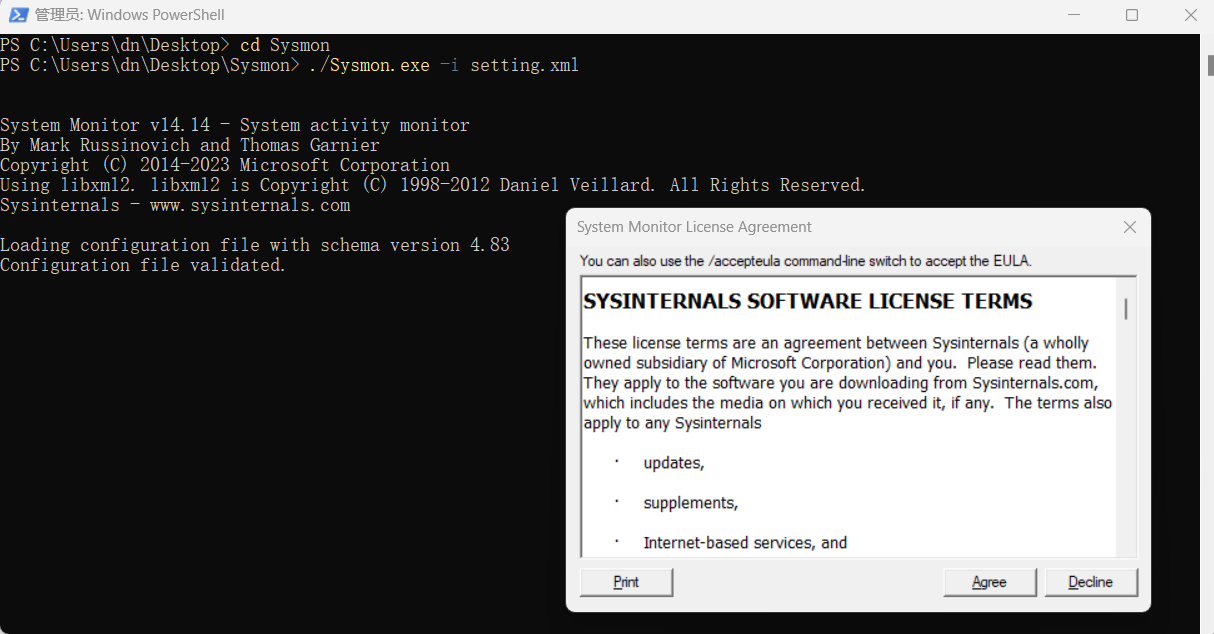 - 安装配置sysinternals里的sysmon工具,设置合理的配置文件,监控自己主机的重点事可疑行为。(1分)