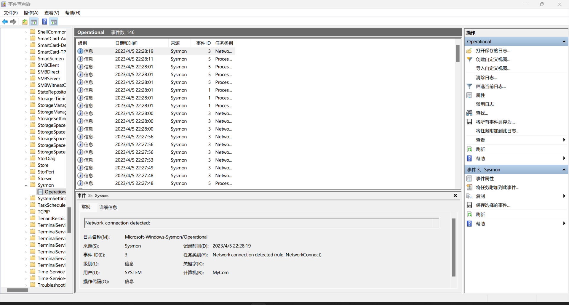 - 打开 计算机管理->事件查看器->应用程序和服务日志->Microsoft->Windows->Sysmon->Operational 查看日志
