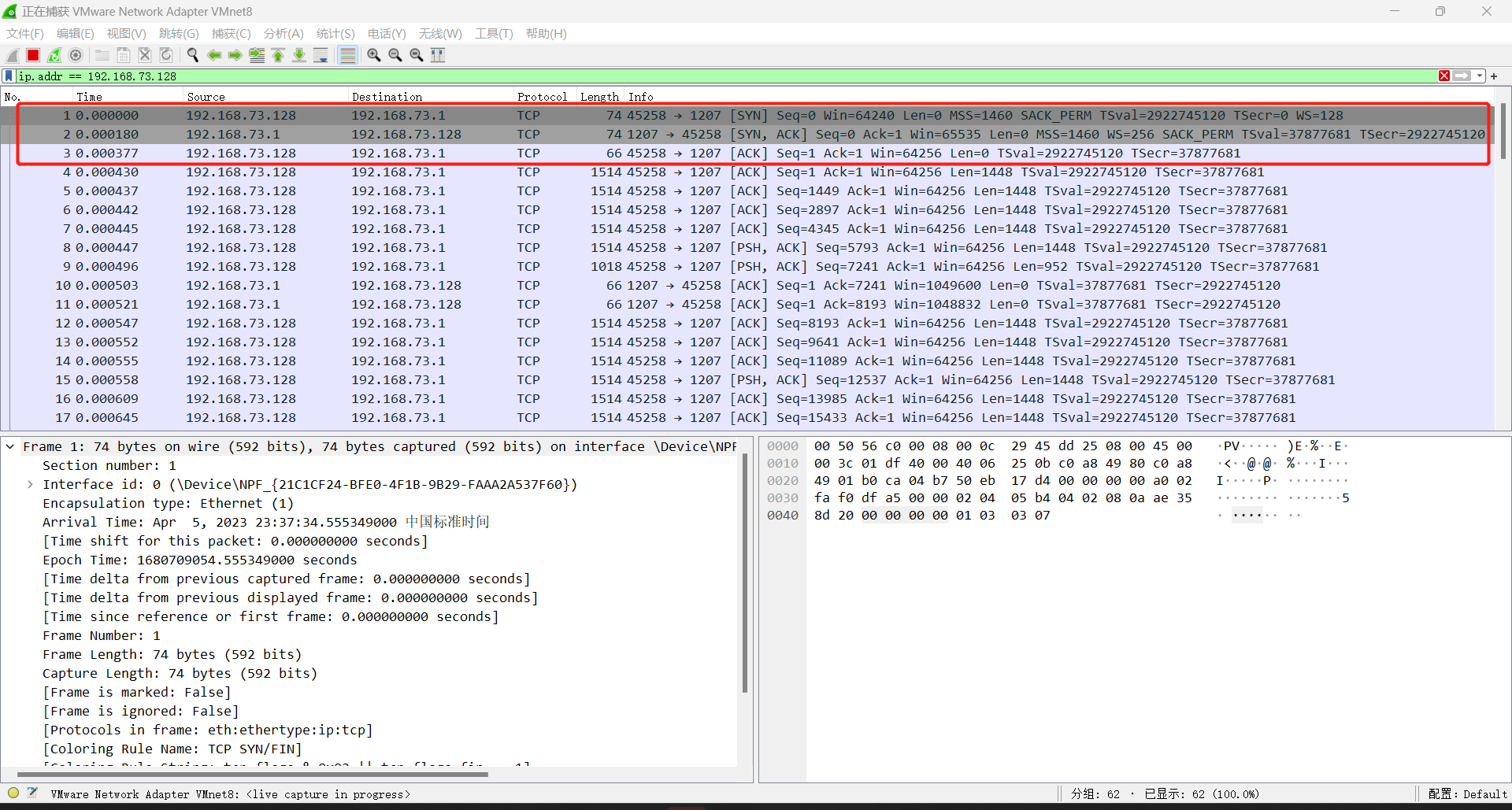 - 这里分析一下抓到的包:第一行Frame8主要是要发送的数据块;使用以太网,标明了源Mac地址和目的Mac地址,由于我这里是一台机器上利用VMware来进行通信,所以图片中标明了VMware;第三行指本次传输中使用了IPV4协议,标明目的ip和源ip;第四行使用了TCP协议进行通信,源端口号和目的端口都有标明;最后一行为data包,不是所有抓到的包都有,有这一行意味着这个包携带了多大字节的数据量。