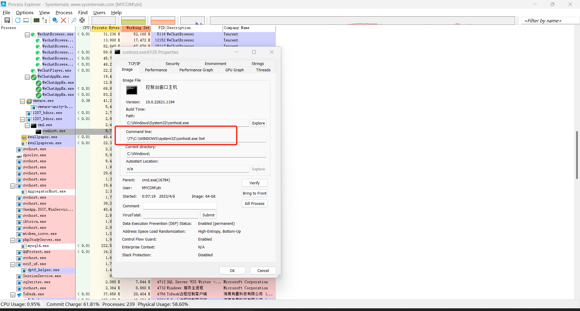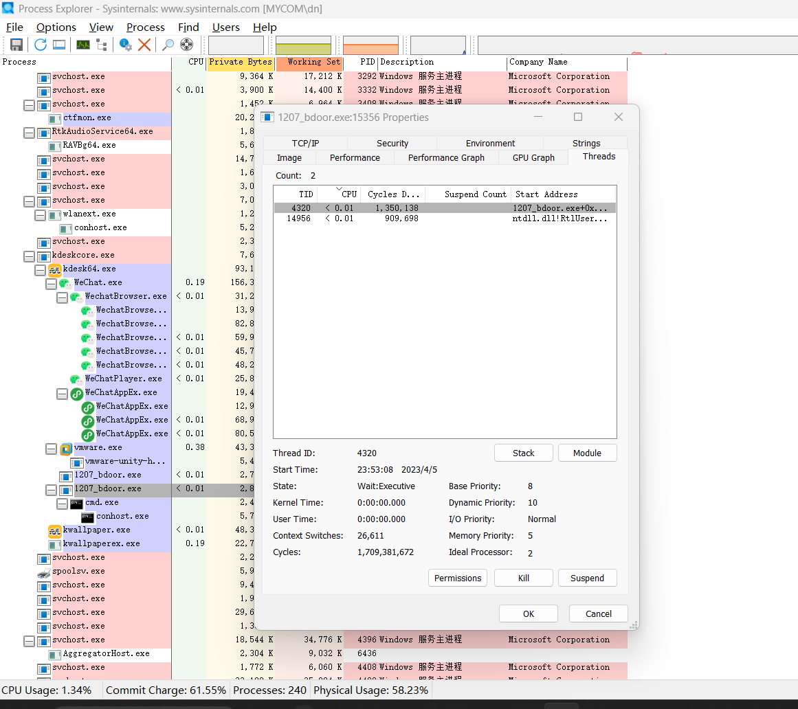 - 而由于我在Kali机中使用shell命令直接获取windows主机权限的行为太过明显,也是直接在procexp中脱颖而出很快被发现查杀