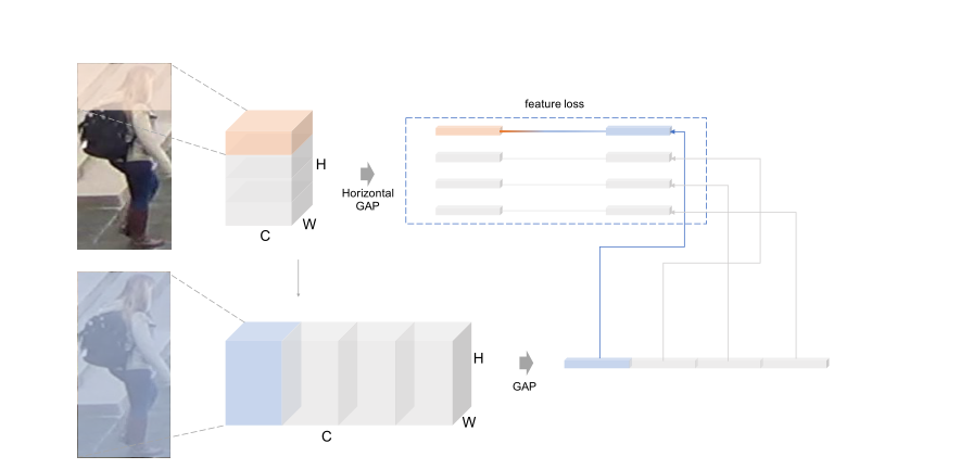 这实际是一个再学习过程,损失函数迫使每个通道维特征去学习相应的局部空间特征。这可以较好的应对错位,因为即使相关部位出现的在输入图像的其他位置,也可以从整个输入图像中自动提取相应的部分。因此,在局部特征的监督下,全局特征的每个部分都被迫学习对应于局部特征的特征表示。而且,与局部特征不同的是,全局特征的每个部分均有全局的感受野,从而可以更好地表示相应的局部区域。它也没有严格的空间分割,因此全局特征对姿态变化和不准确的边界框具有更强的鲁棒性。