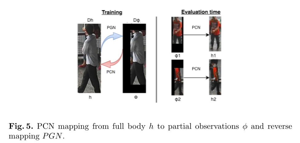 通过定义两个映射函数“行人完整网络”(PCN)和“部分生成网络”(PGN)来实现,这两个函数将对齐的部分观测φ转换为全身框架h,反之亦然,如图5所示