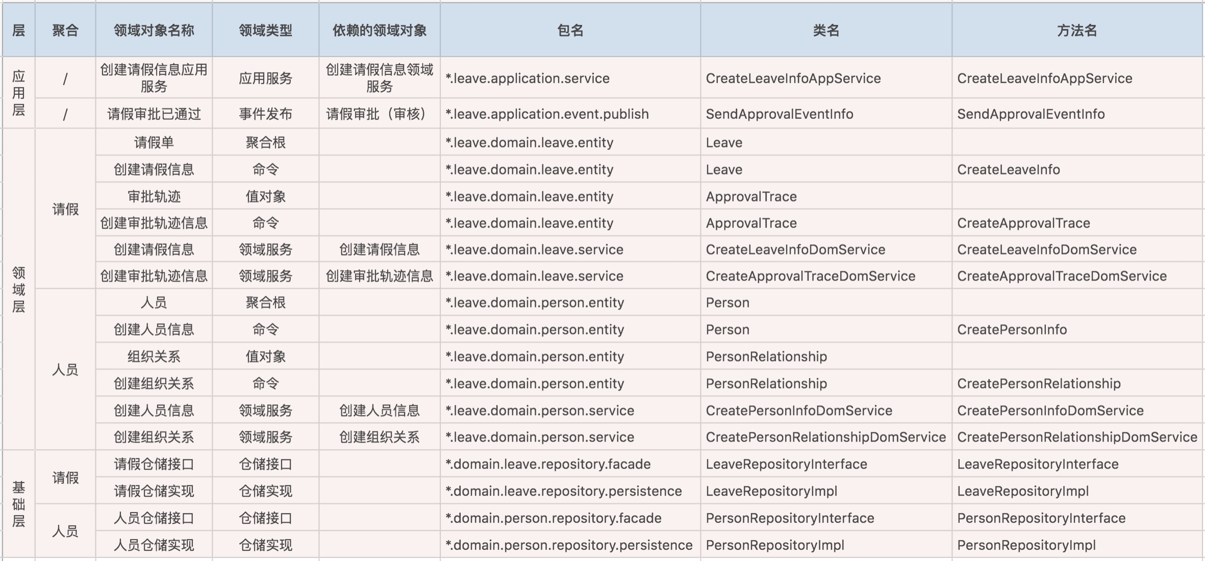 设计过程中可以用一些表格,来记录事件风暴和微服务设计过程中产生的领域对象及其属性。比如领域对象在DDD分层架构中的位置、属性、依赖关系以及与代码模型对象的映射关系等。