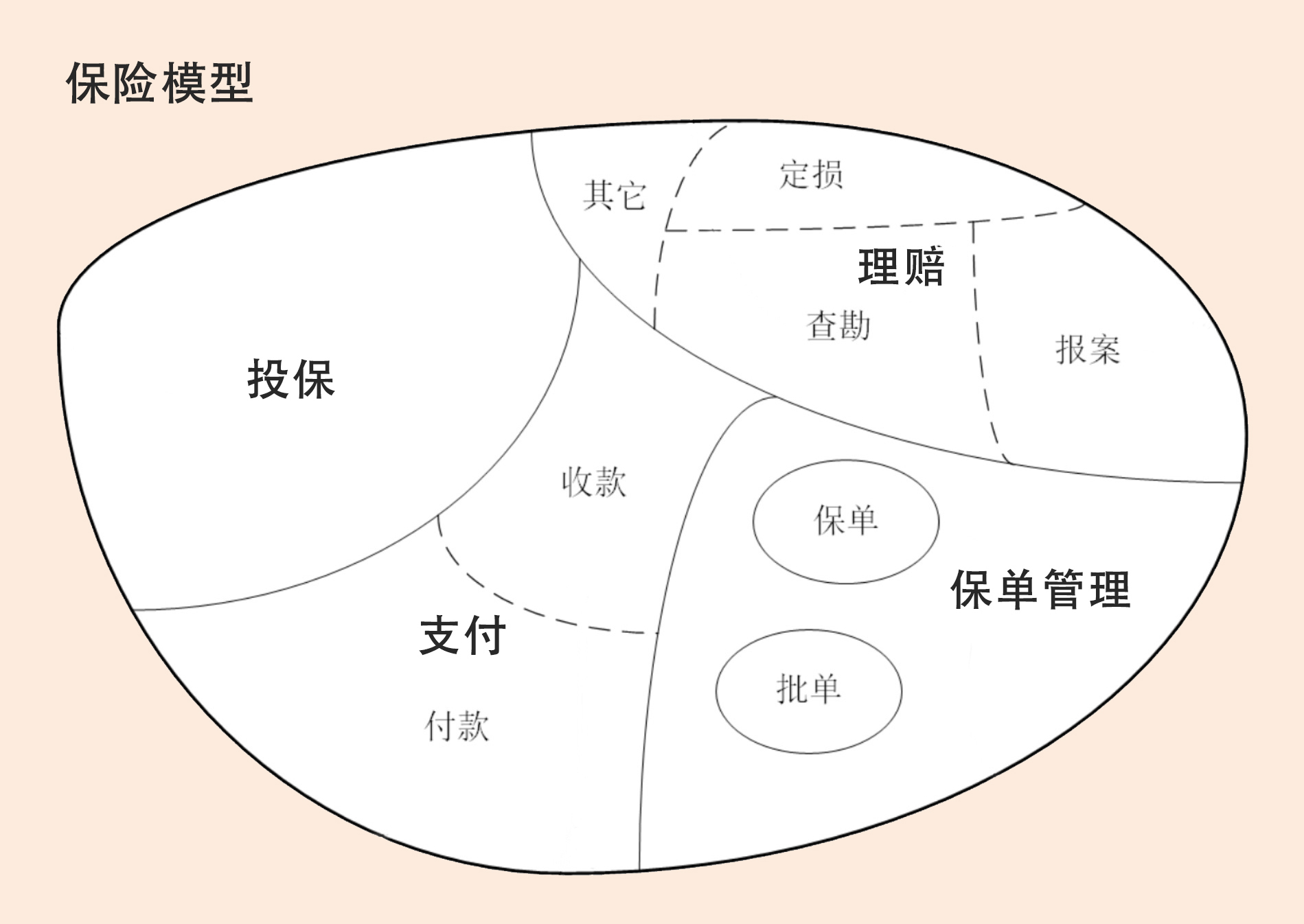 首先,保险领域被拆分为投保、支付、保单管理、理赔四个子域。