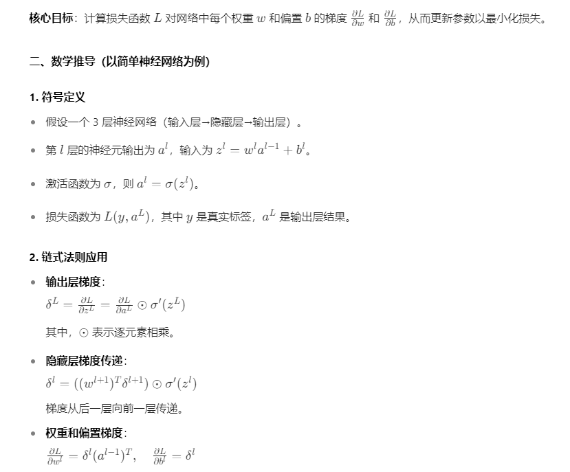在神经网络中,反向传播(Backpropagation) 是一种高效计算损失函数梯度的算法,也是训练深度学习模型的核心技术。以下从原理、数学推导、计算流程、代码实现等方面详细解析: