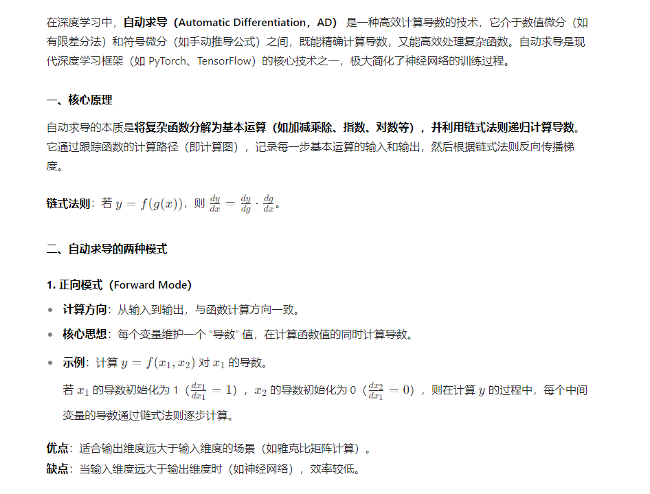 | 自动求导(反向模式) | 精确,高效,适合大规模参数优化 | 需要存储计算图,内存消耗大 |