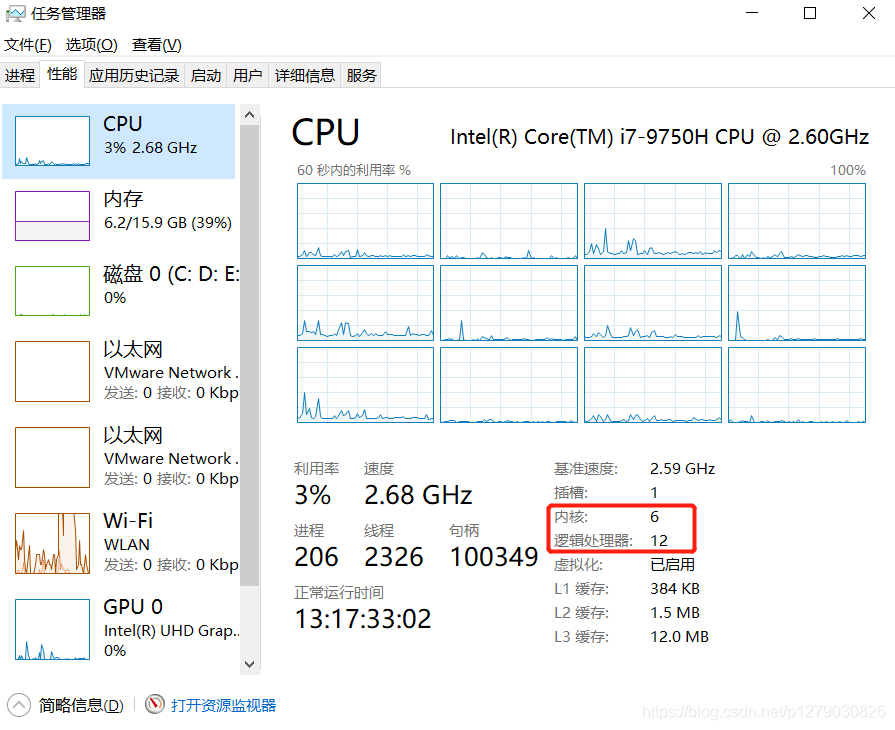 处理器内核总数 对应的是 物理CPU的线程数(逻辑处理器数量)。