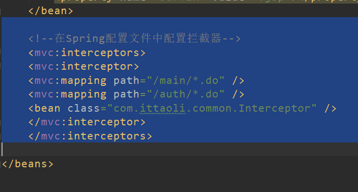 一. 在pring-mvc.xml文件中配置拦截器的Bean文件,如图,如果需要配置多条路径,只需要增加一个<mvc:mapping path=""/> 标签