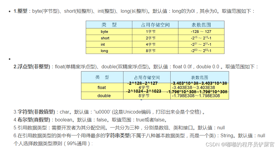 ②表数的范围:就拿byte的范围-128到127之间,声明byte类型变量的时候赋值不能超过这个范围,给byte类型变量赋值时不能超过这个范围