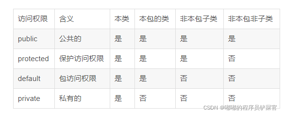 - default:表示不加任何访问修饰符(通常称为“默认访问权限“或者“包访问权限”)