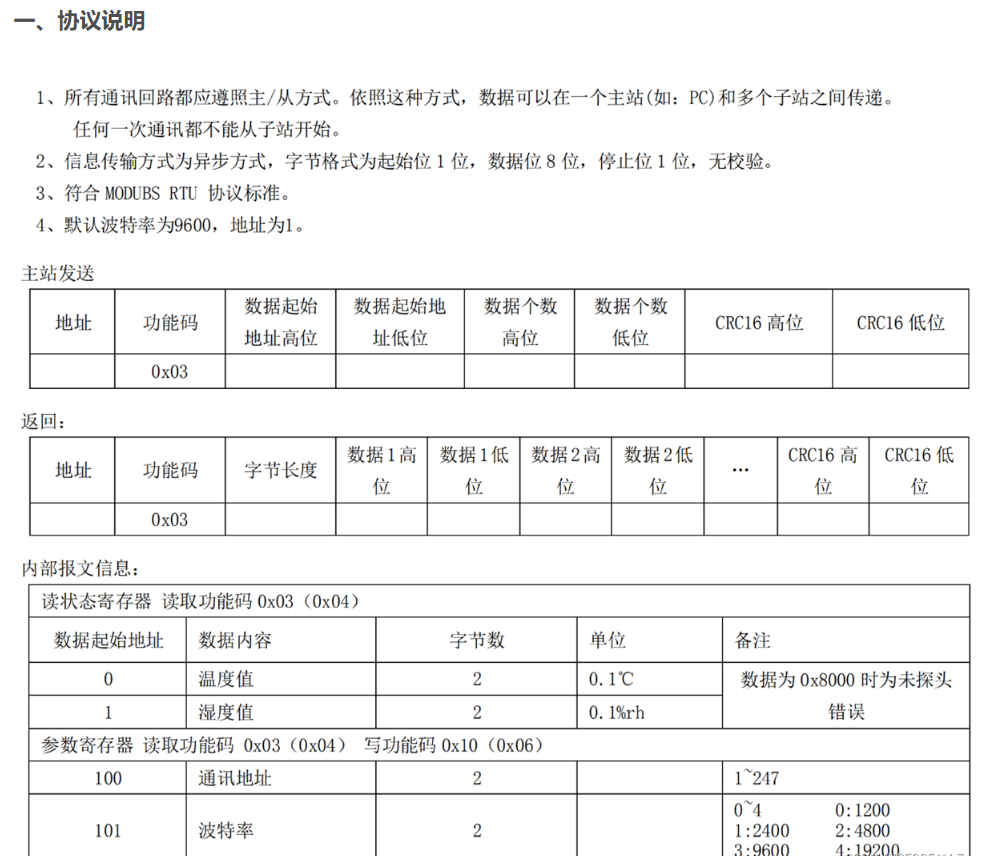 主机读取温湿度数据命令帧:01 03 00 00 00 02 C4 0B
