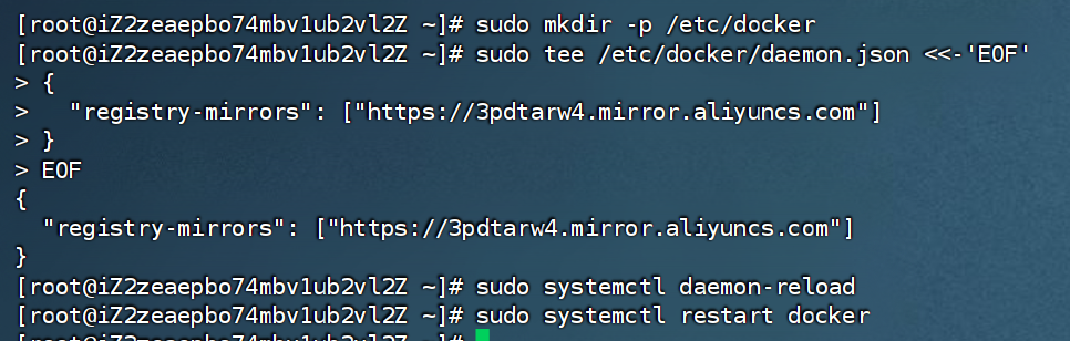 sudo mkdir -p /etc/docker sudo tee /etc/docker/daemon.json <<-'EOF' { "registry-mirrors": ["https://ijmr3it2.mirror.aliyuncs.com"] } EOF sudo systemctl daemon-reload sudo systemctl restart docker