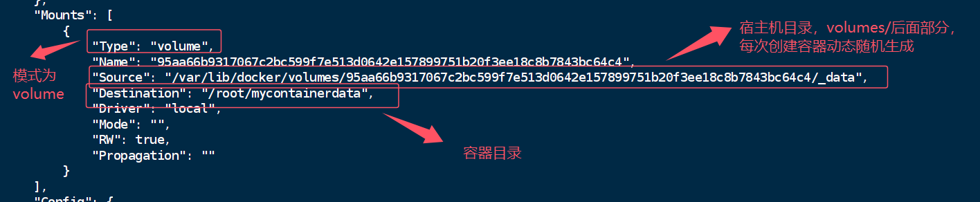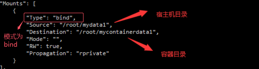运行【docker inspect mycentos2】 ,查看Mounts节点,宿主机和容器的挂载目录对应关系