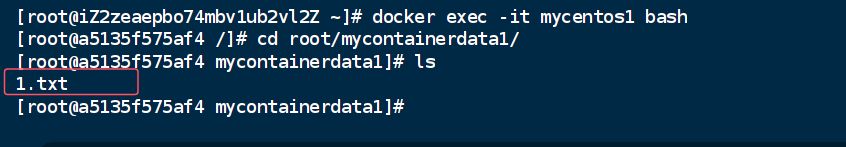 重新运行 [docker run -id --name=mycentos1 -v /root/mydata1:/root/mycontainerdata1 centos ]