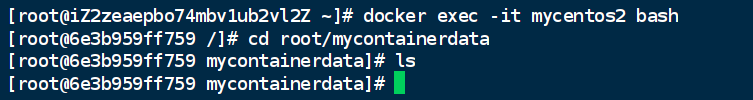 【docker run -id --name=mycentos2 -v /root/mycontainerdata centos】
