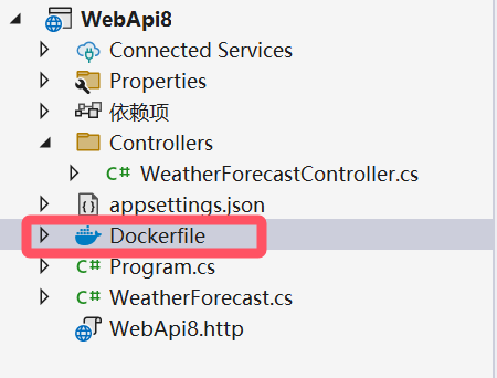 新建一个Asp.Net Core WebApi项目,版本8.0 ,右键对其添加docker支持,会自动生成一个Dockerfile文件,如下: