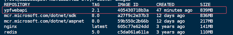 【docker build -t ypfwebapi:2.1 . 】,然后运行 【docker images】