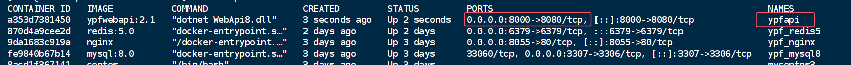 【docker run -id --name=ypfapi -p 8000:8080 ypfwebapi:2.1】 然后通过指令 【docker ps】查看镜像