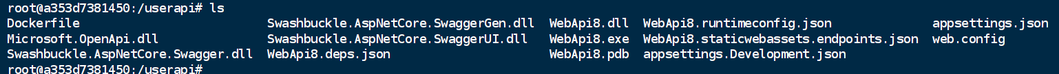 在该容器内,查看工作目录下的内容 【ls】,发现就是发布包中的内容哦,这时通过Dockerfile中的 【copy . /userapi/】实现的。
