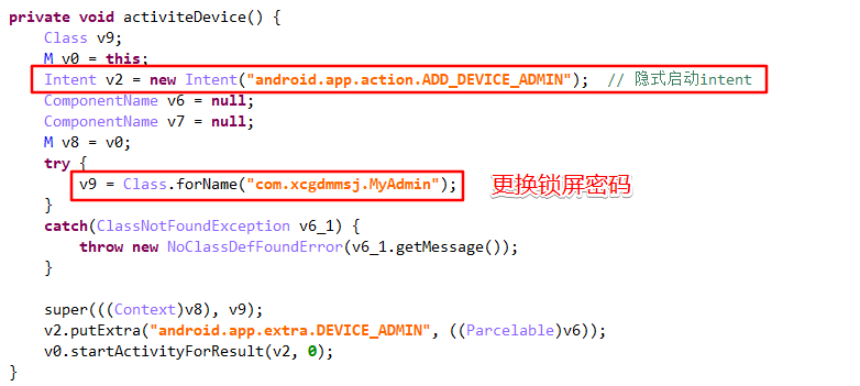 activiteDevice()中通过隐式intent弹出激活设备管理器界面,然后反射调用MyAdmin()。