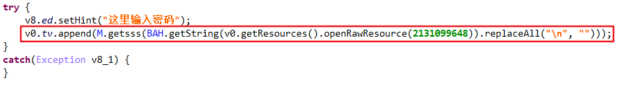 查看点击事件,逻辑是判断用户输入的内容,密钥正确则调用removeView()删除置顶弹窗并结束线程。解密算法与解PIN是一致的,都是获取raw下某个文件的内容后调用getsss()进行解密。此处的解锁密码为336699。