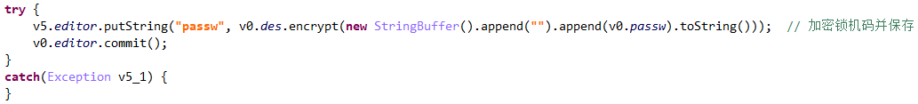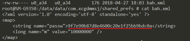 然后采取DES算法通过密钥"bah"解密内容"c29fe56fa59ab0db",通过DU()类初始化得到第二个密钥,对锁机码进行加密,保存在/data/data/com.xcgdmmsj/shared_prefs/bah.xml中