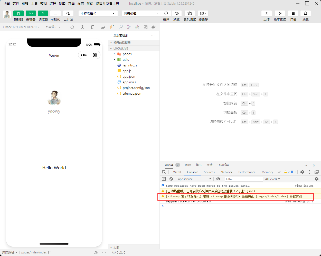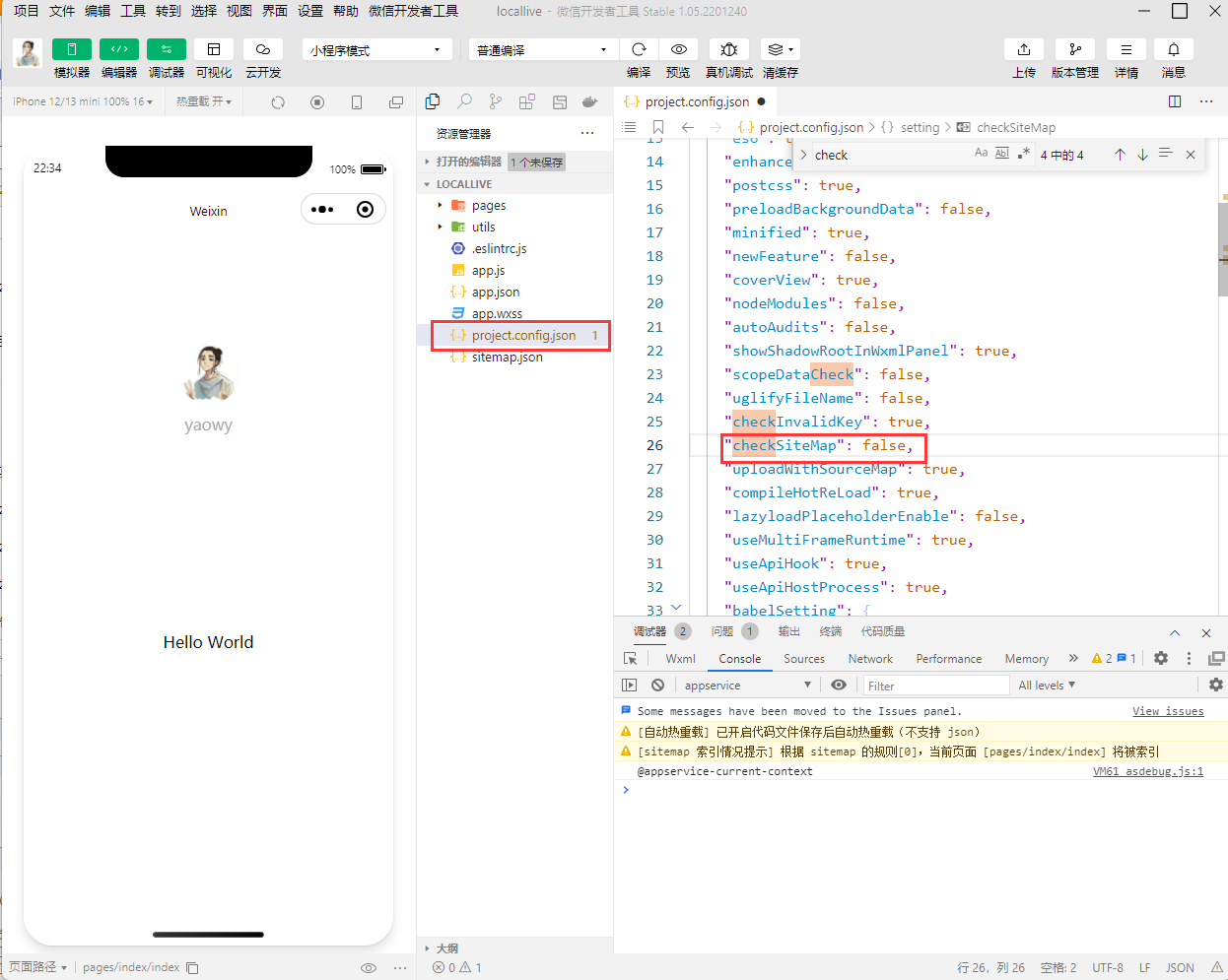 如果想关闭这个黄色警告,打开project.config.json文件,找到setting部分,找到checkSiteMap,这个值默认是true,我们把它改为false,然后重新编译会发现,黄色警告没了