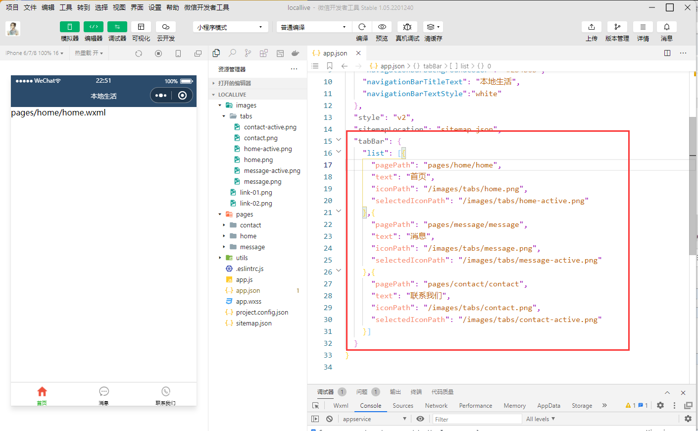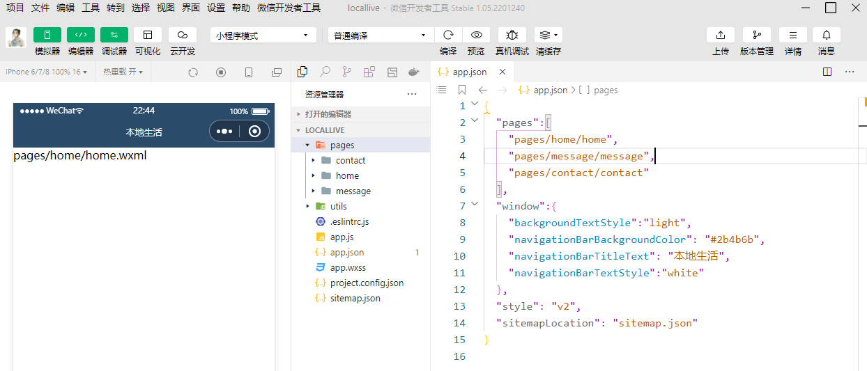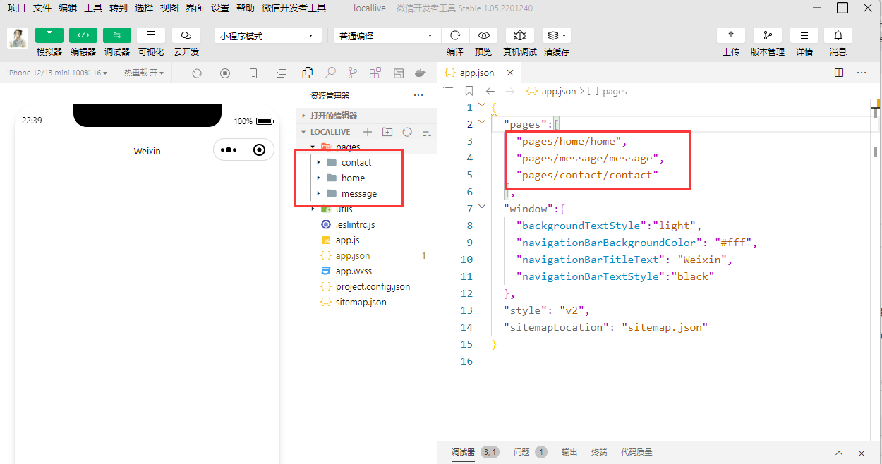 在app.json文件中,直接在pages块配置三个页面路径,开发工具会自动帮我们生成三个页面文件夹。