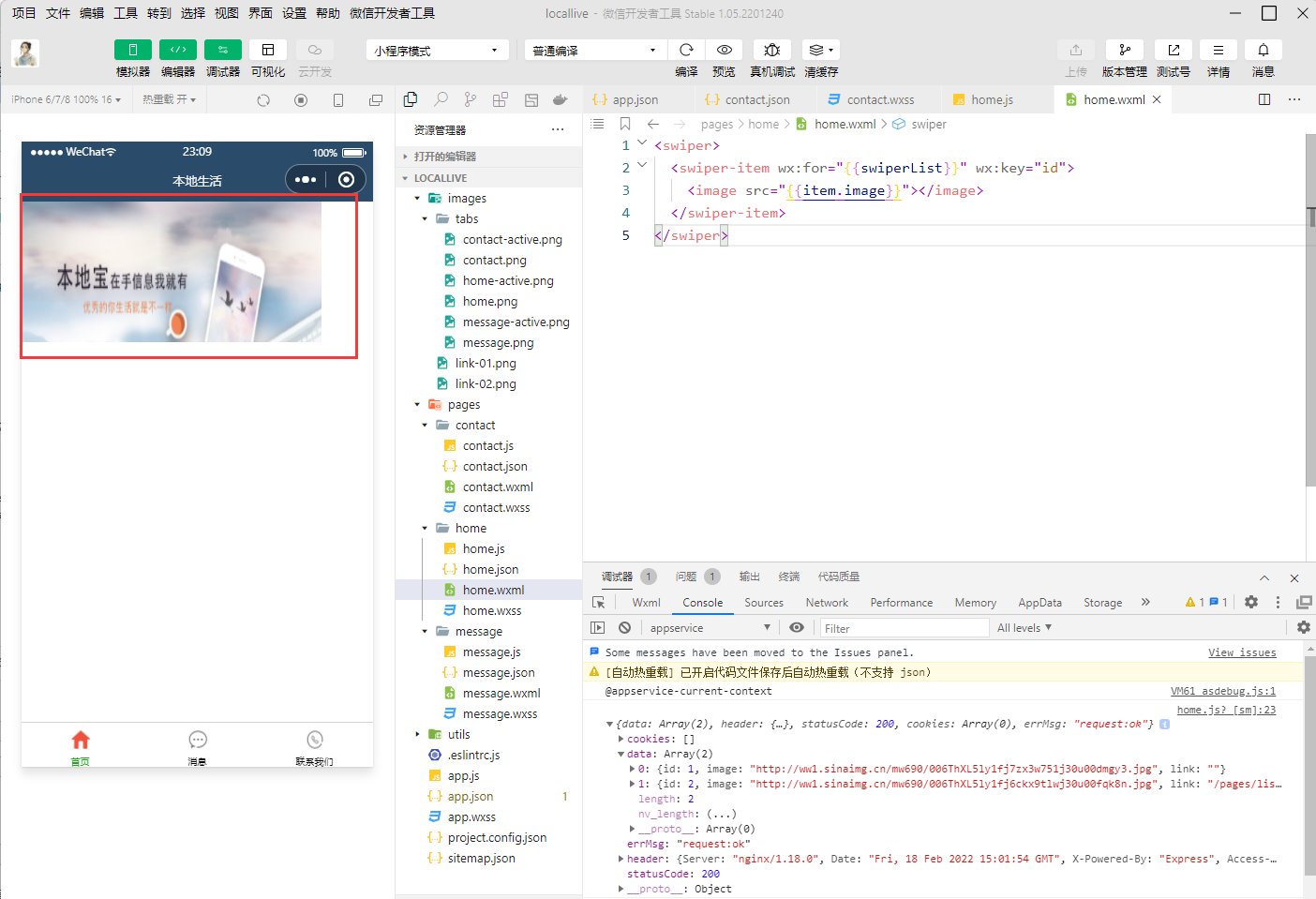 编译测试,因为获取轮播图数据的方法在onload方法内被调用,因此,只要home页面被加载,该数据就会被请求