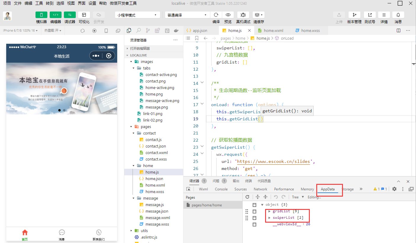 获取轮播图数据,这里的数据是从老师的一个网站上获取,轮播图是在首页展示的,打开pages/home/home.js文件